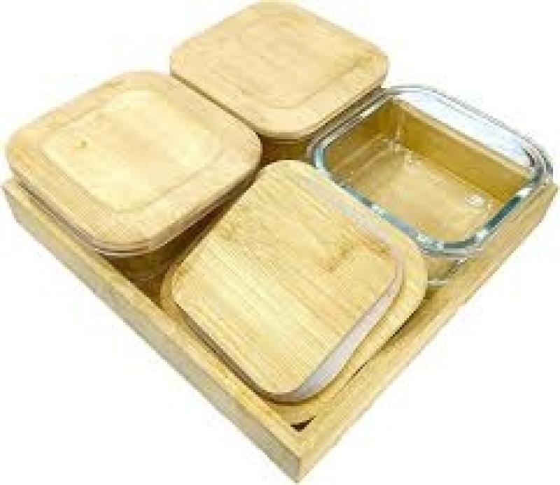 • طقم تقديم علب زجاج مع قاعدة خشب